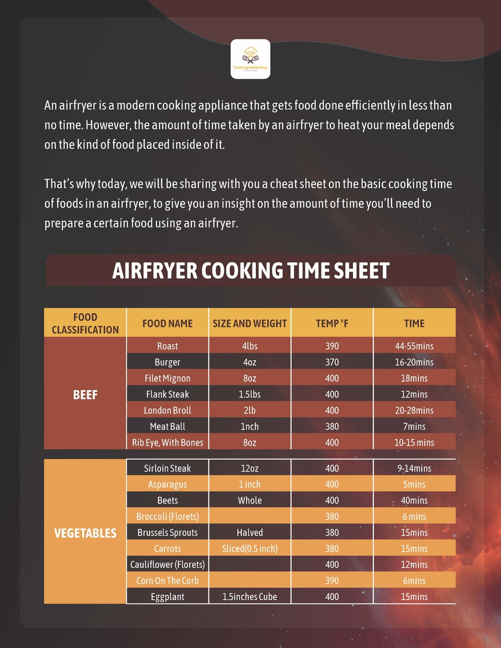 Air Fryer Downloadable Cheat Sheet - see all of the cooking times for your Air Fryer at a Glance. Colorful easy to read cheat sheet.